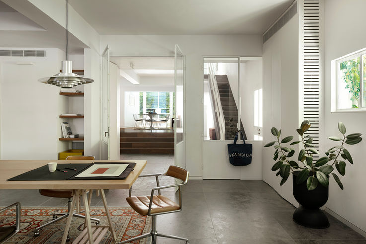 סטודיו משפחתי בבית פרטי בתל אביב - חלל שהוא דיאלוג בין סביבת עבודה לבין מרחב משפחתי מזמין ורגוע.